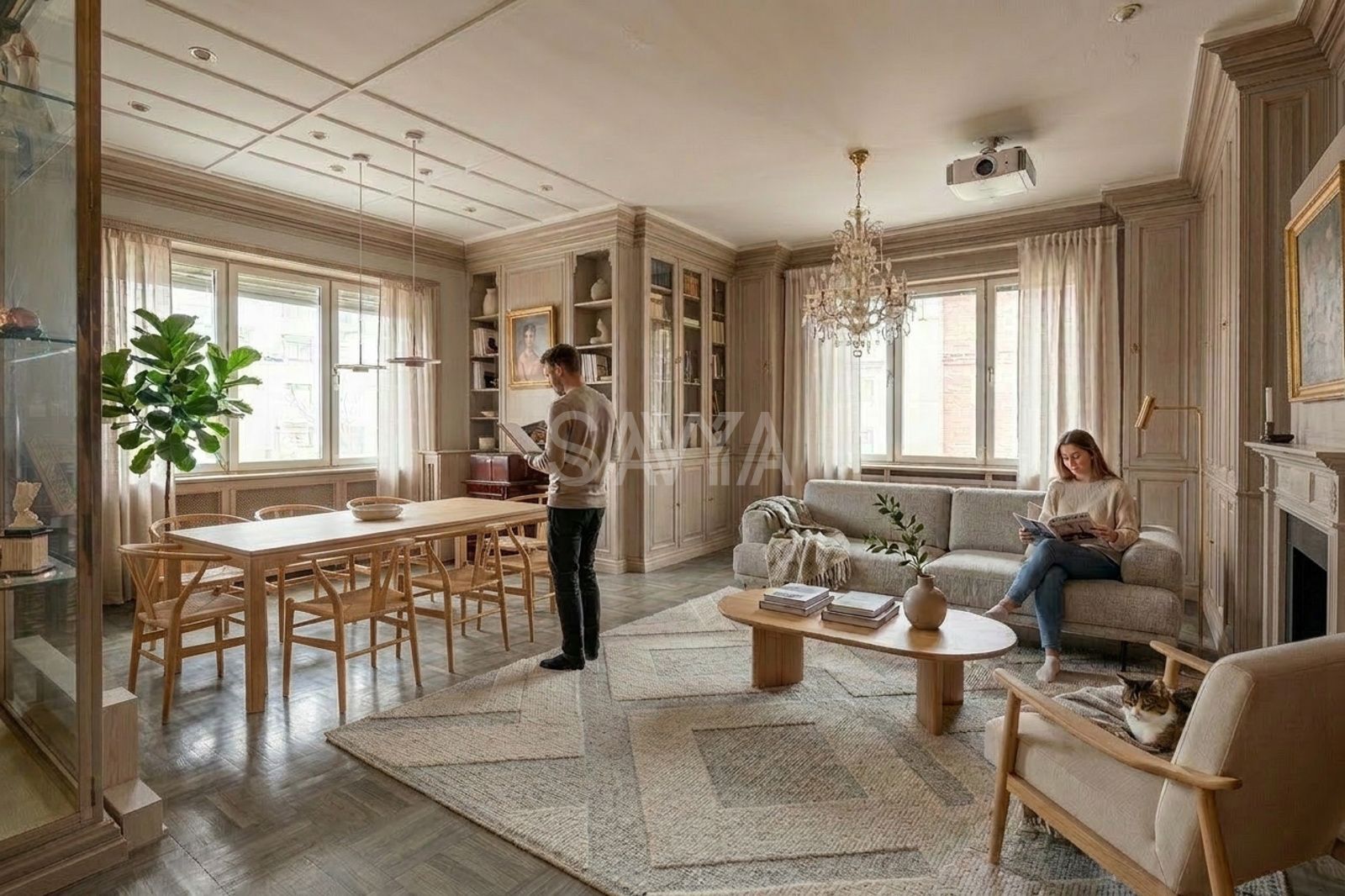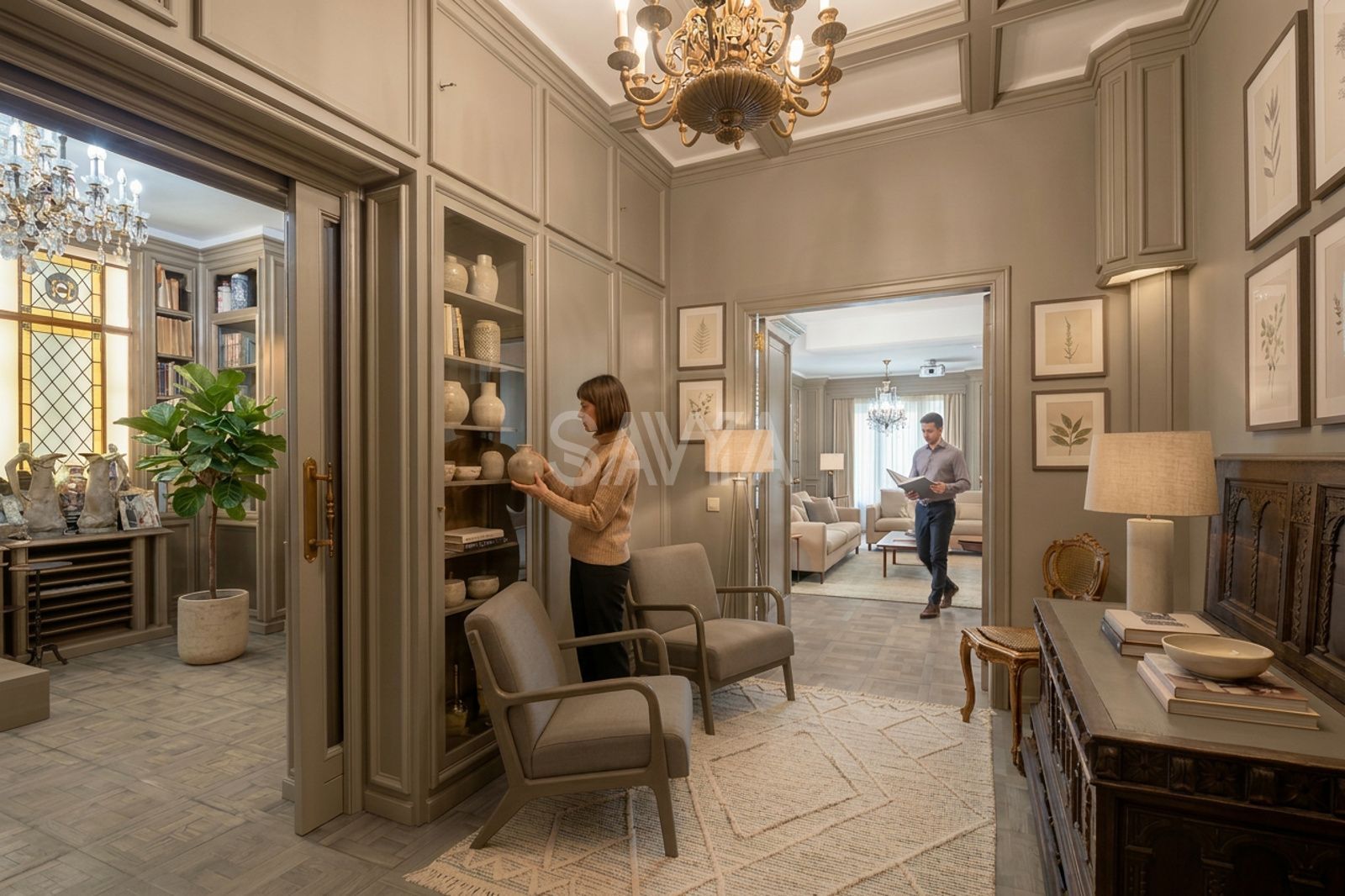 L’entrada s’obre a un ampli rebedor que dóna accés a una estança annexa habilitada com a biblioteca.