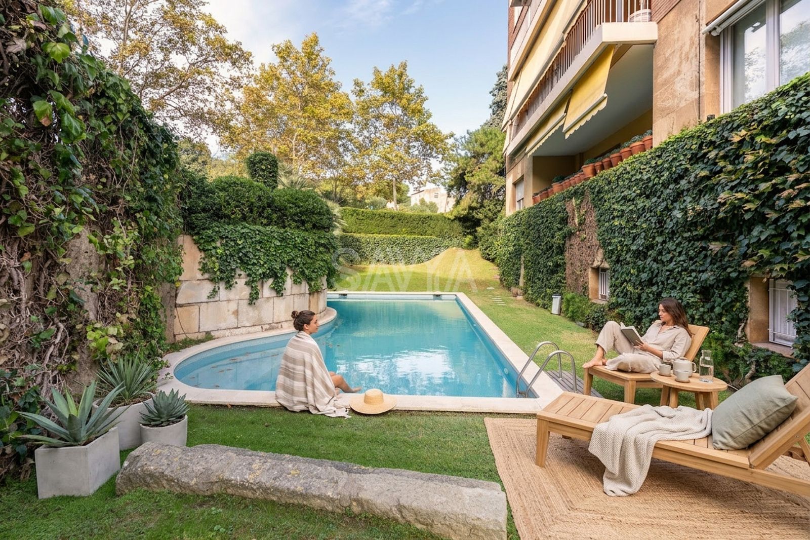 La finca ofereix zones ajardinades, piscina comunitària i servei de consergeria.