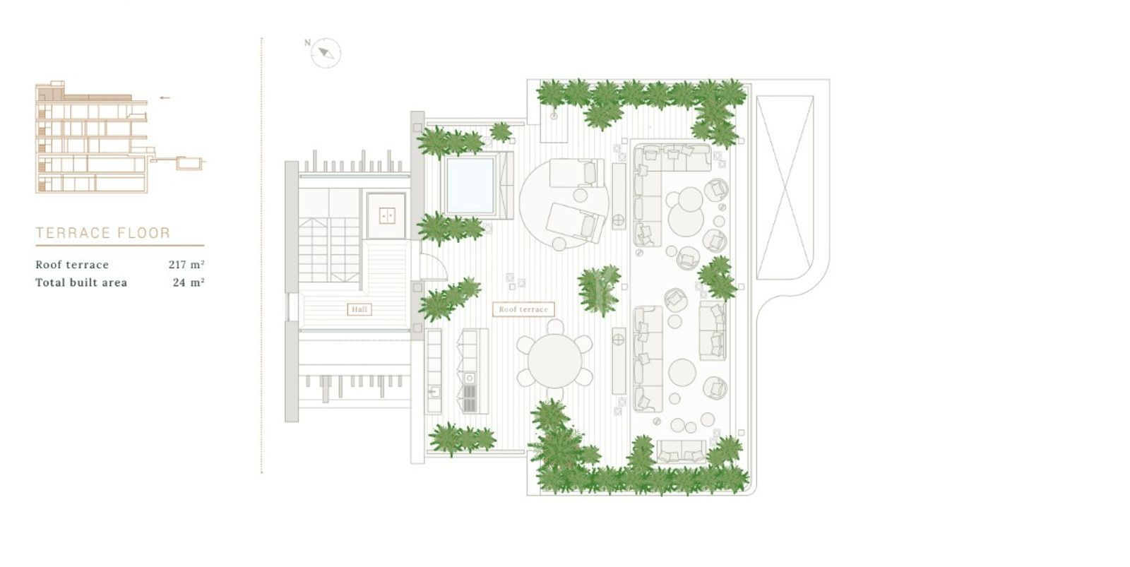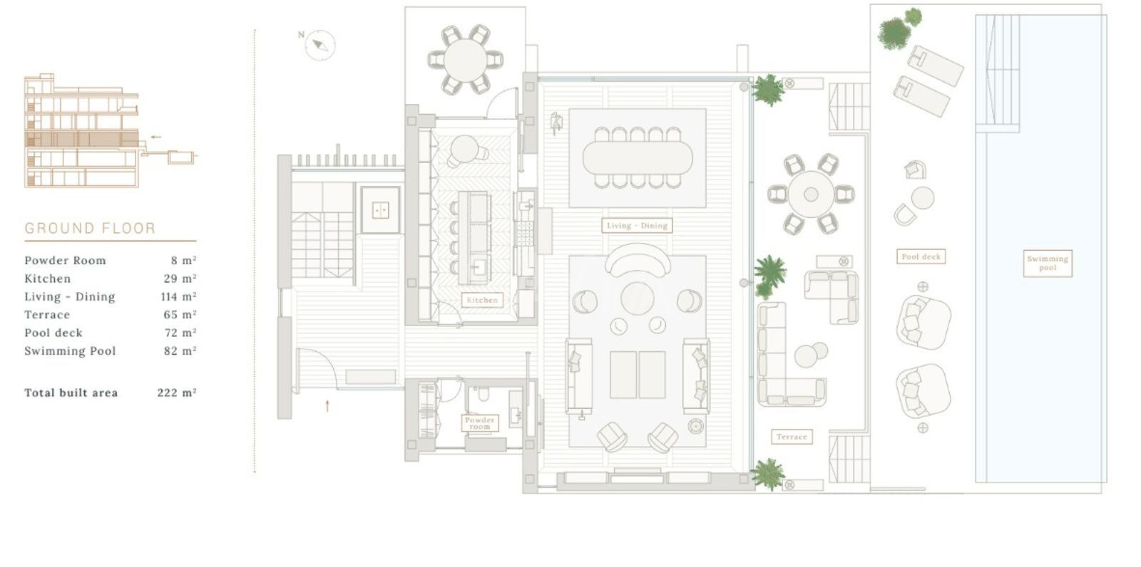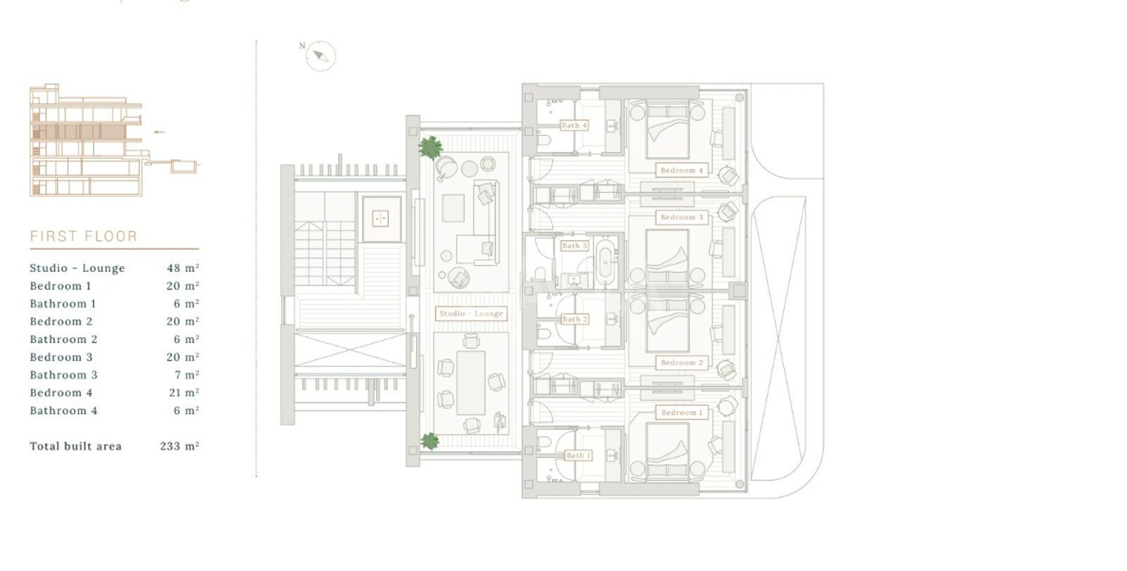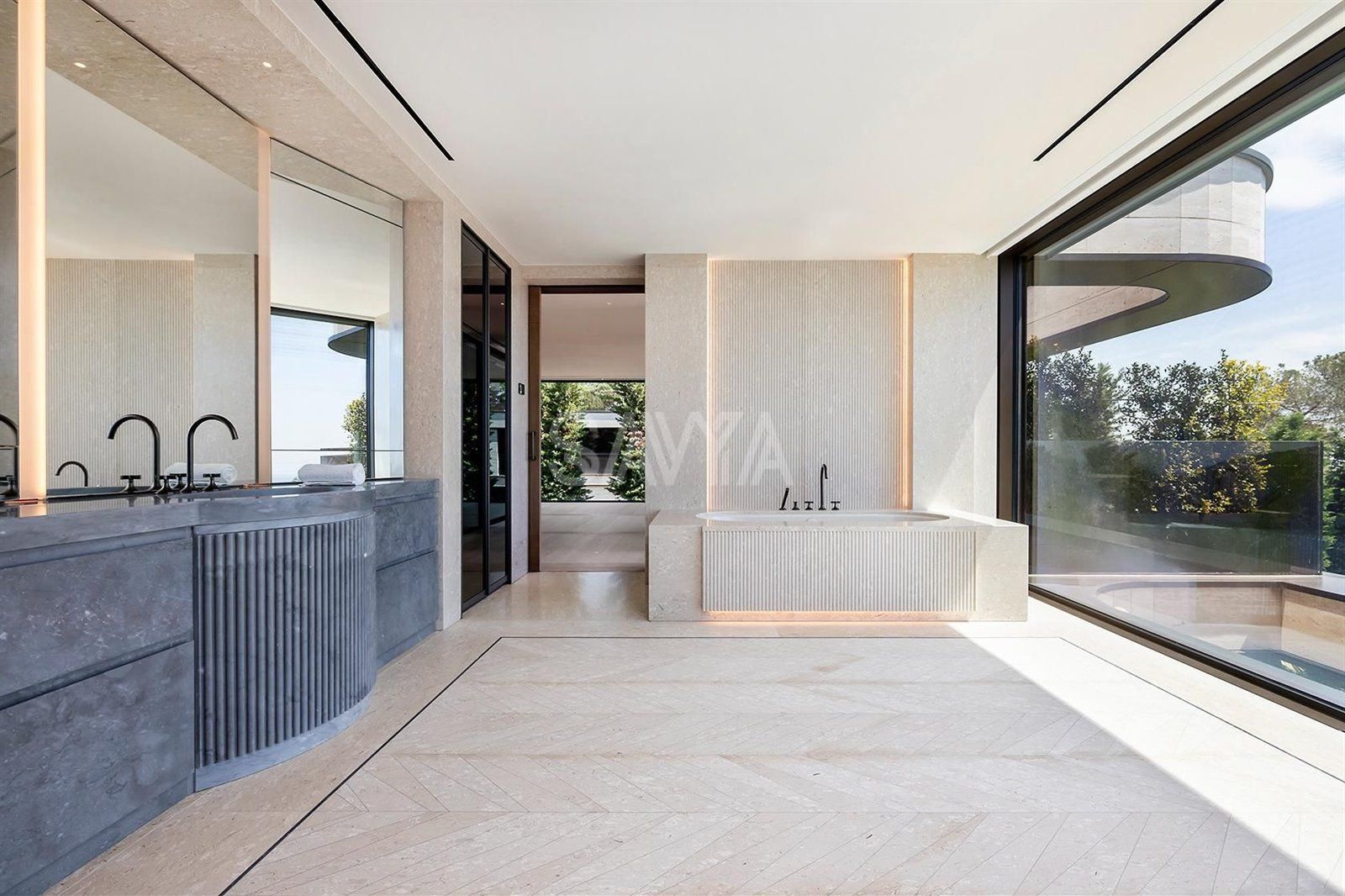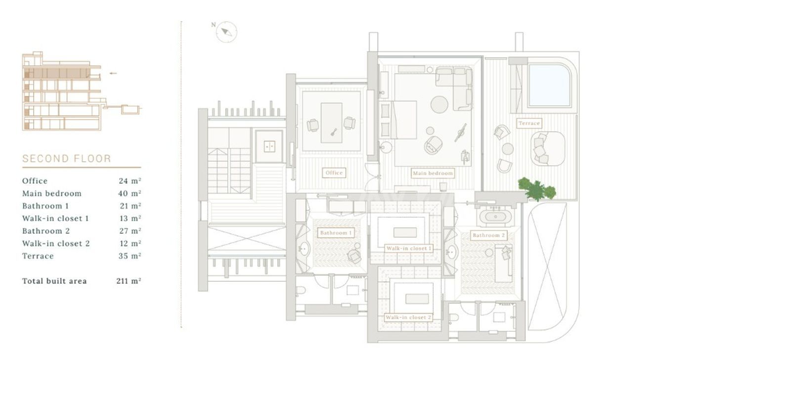 La zona de descanso ofrece privacidad con dormitorios en suite, vestidores y terrazas propias, mientras que una oficina privada satisface las necesidades de trabajo desde casa.