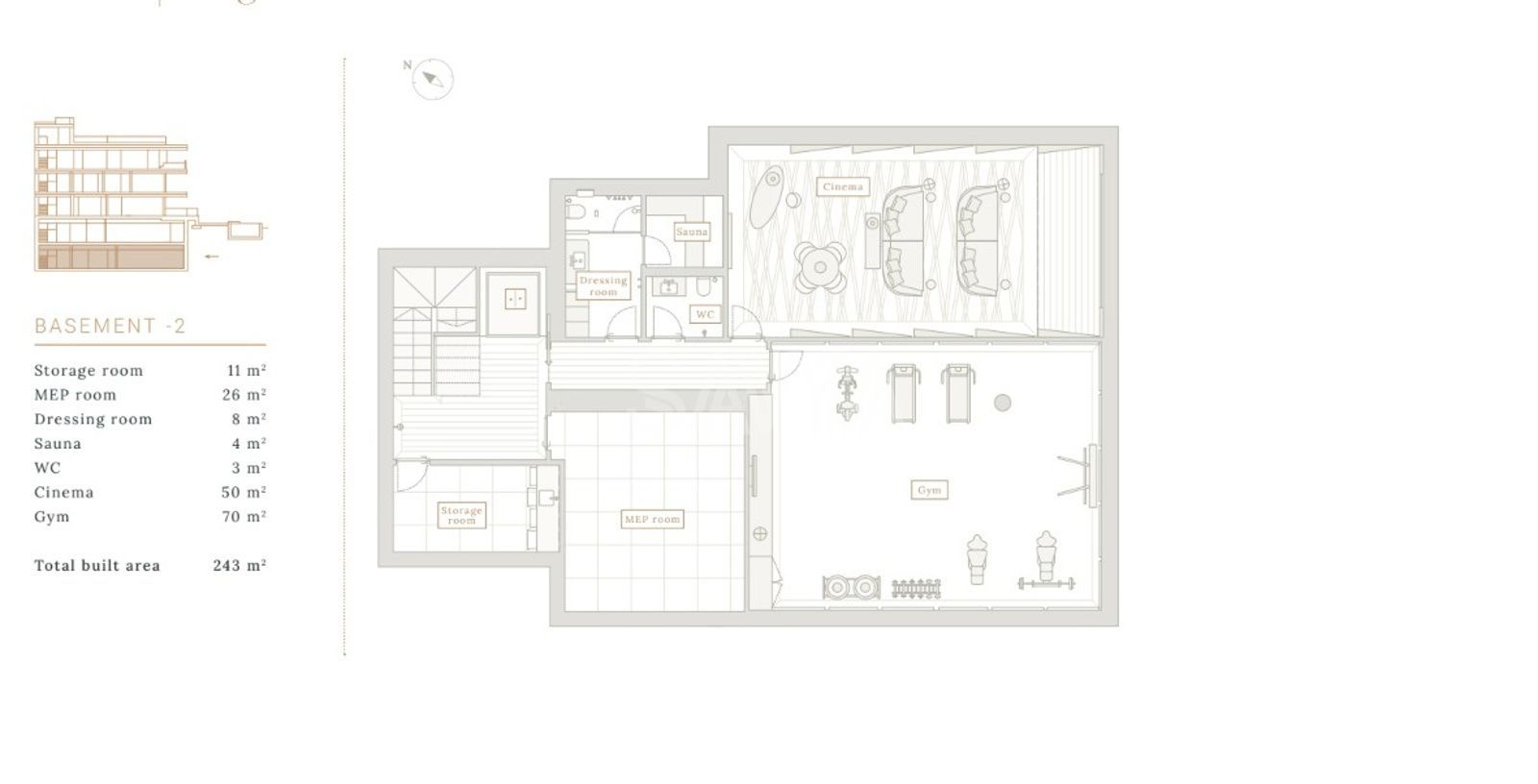 Las áreas de ocio incluyen gimnasio, sauna, sala de cine y sala de juegos con bar, además de una bodega para colecciones exclusivas.