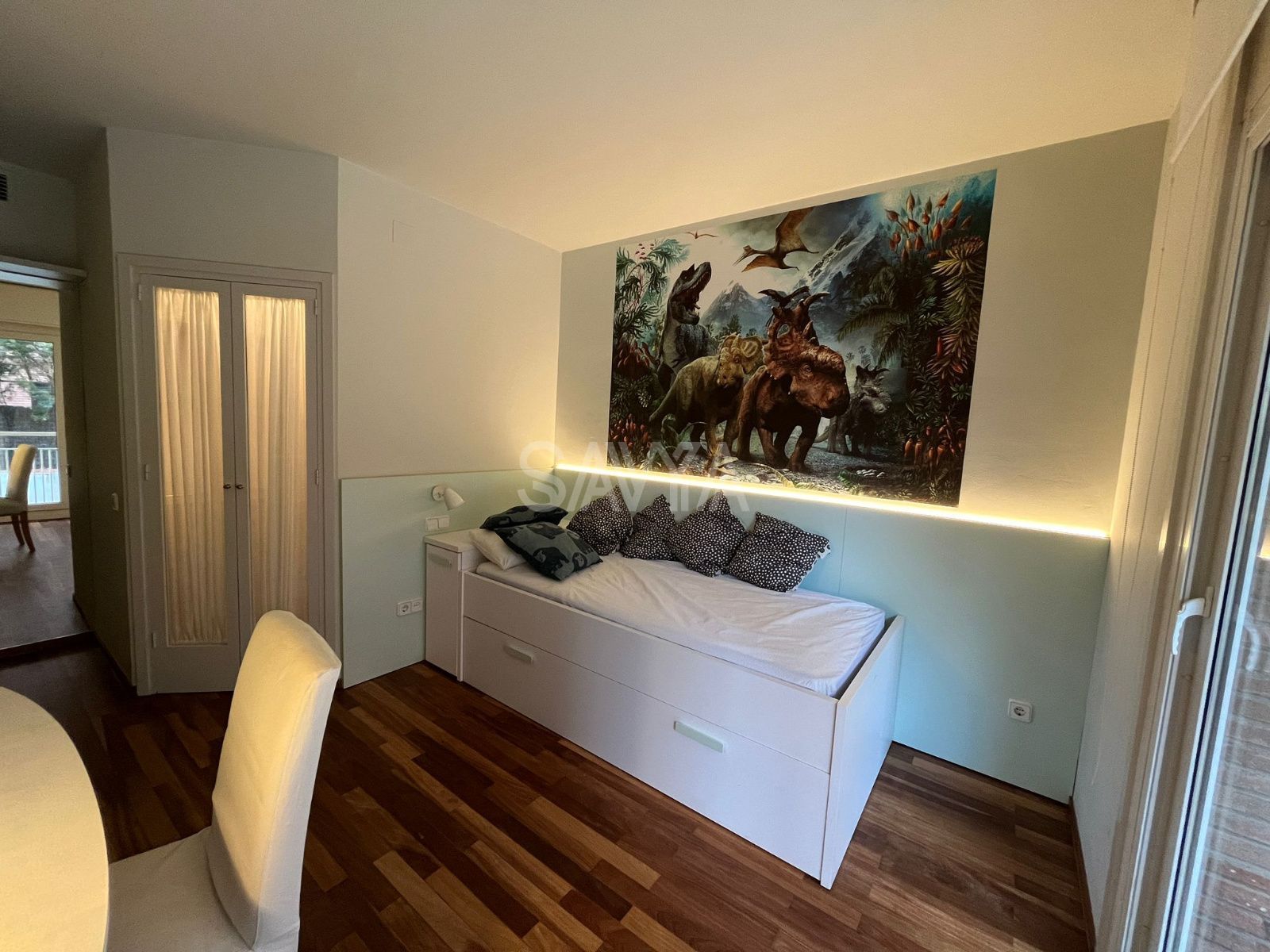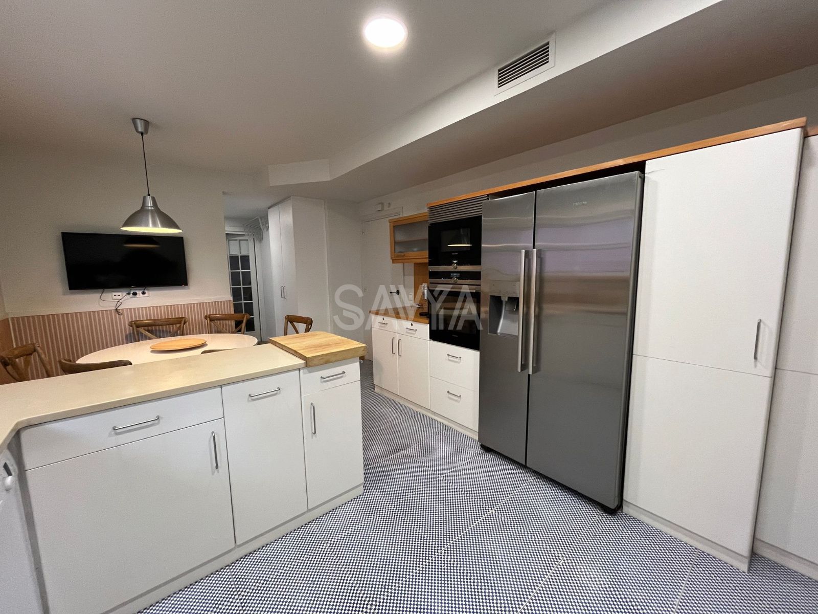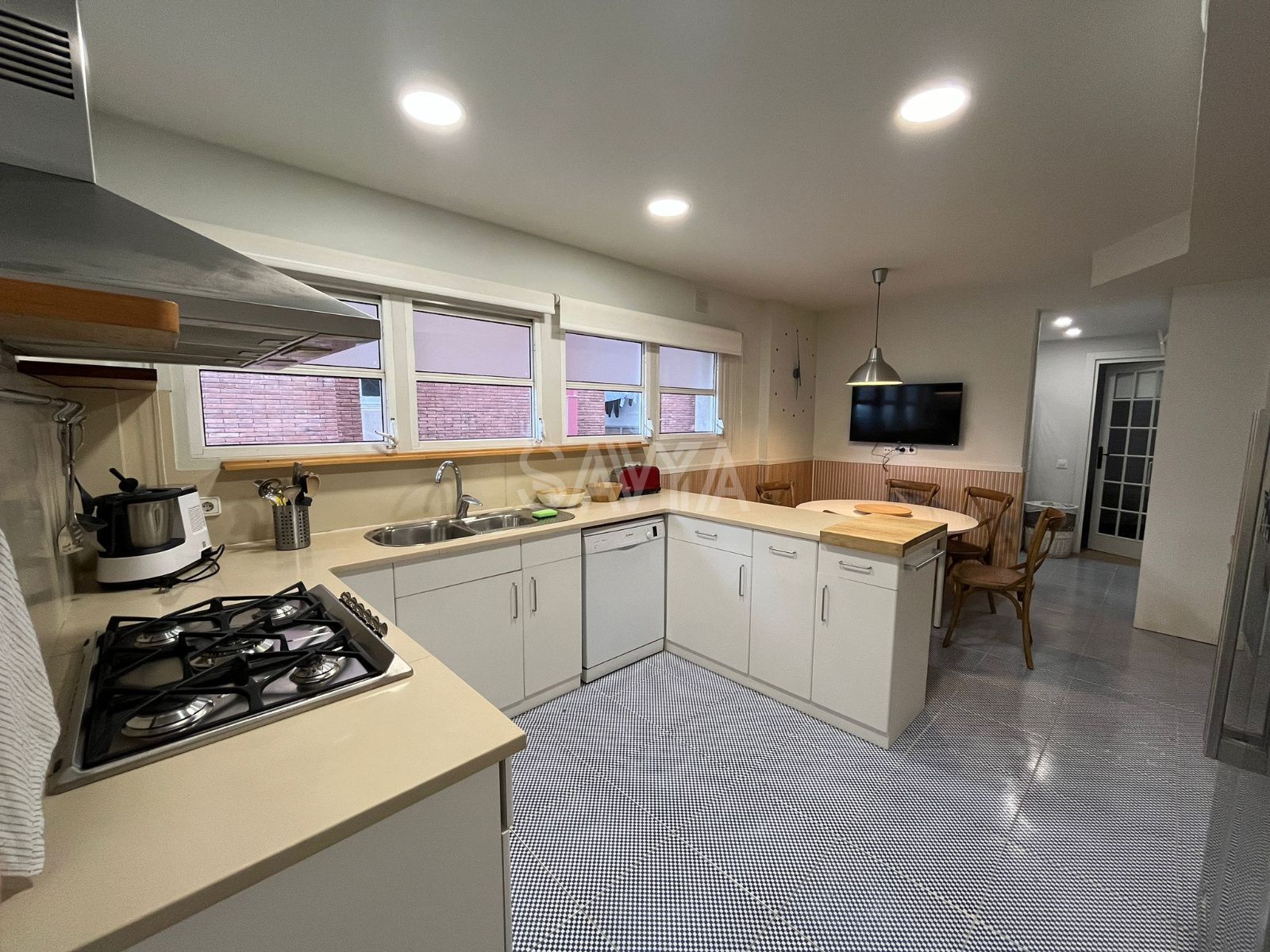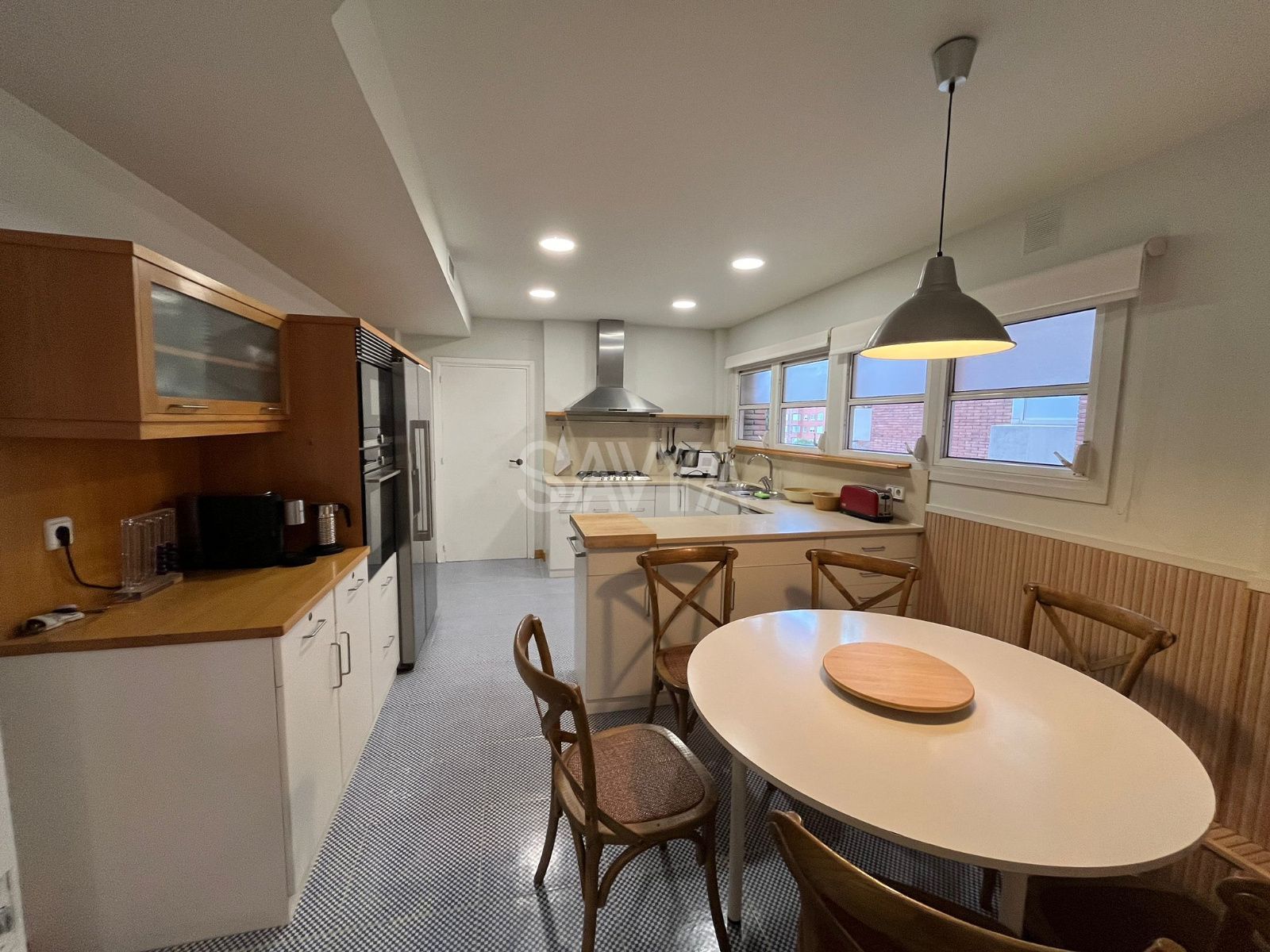 La zona de día se organiza a partir de un recibidor que da acceso a un amplio salón-comedor muy luminoso, con grandes ventanales y salida directa a la terraza principal. Junto a él, encontramos una espaciosa cocina totalmente equipada.