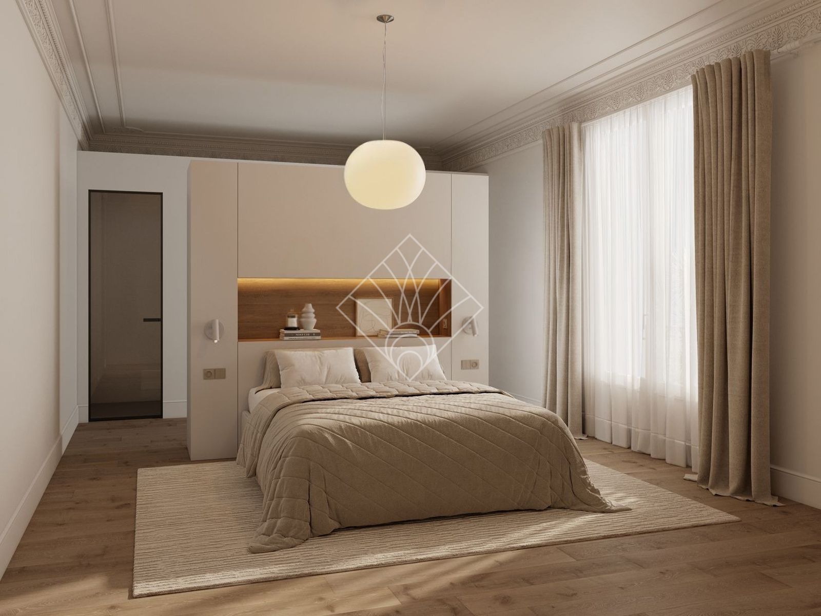 En la zona de descanso tenemos 4 habitaciones dobles muy espaciosas, 2 baños completos a los que no les falta detalle, con la grifería dorada aportando un toque de sofisticación y elegancia, una amplia zona de lavadero, y 1 trastero. Uno de los baños está integrado en la habitación suite, destacable por su gran tamaño, su techo con cornisas y molduras originales, un vestidor y la terraza. Todas las habitaciones cuidadosamente proyectadas, confortables y cálidas, están equipadas con grandes armarios hechos a medida, de madera lacados en blanco y luz interior, que encontramos también en el amplio recibidor, acorde con la magnificencia de la vivienda, de la que somos conocedores nada más entrar.