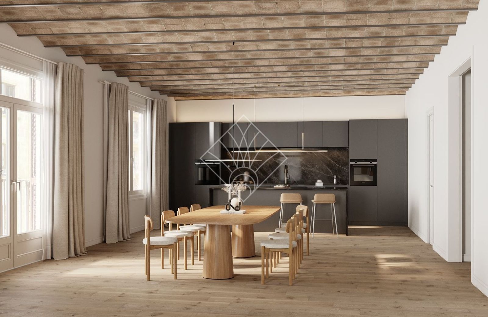 Una cuidadosa reforma integral, amplios espacios y conservación de su identidad, protegiendo elementos artesanales y originales, como los techos altos y las cornisas en el techo y la volta catalana, adaptan la vivienda a las necesidades actuales creando un entorno familiar y agradable.