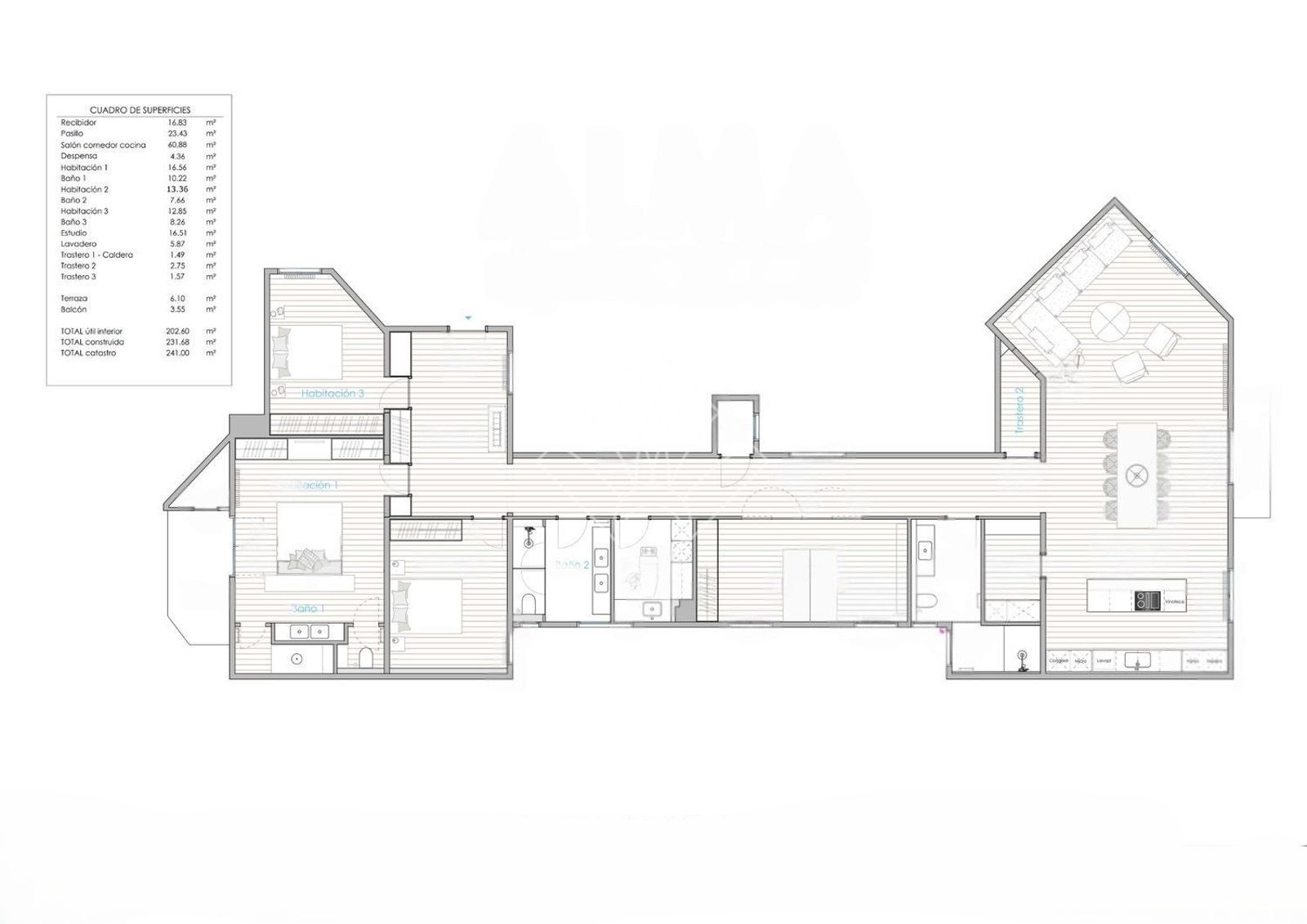 El piso cuenta con un gran salón comedor con cocina integrada, 1 balcón, 1 terraza, 4 habitaciones dobles, 3 cuartos de baño completos, uno en la habitación suite, 1 zona de aguas independiente y 3 trasteros, uno de estos, en el terrado de la finca.