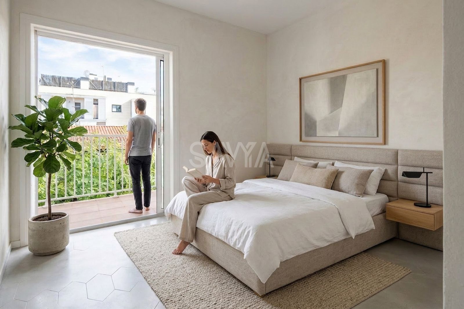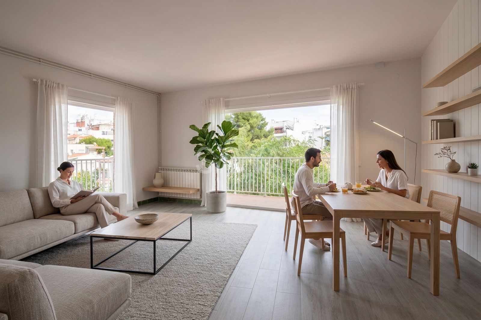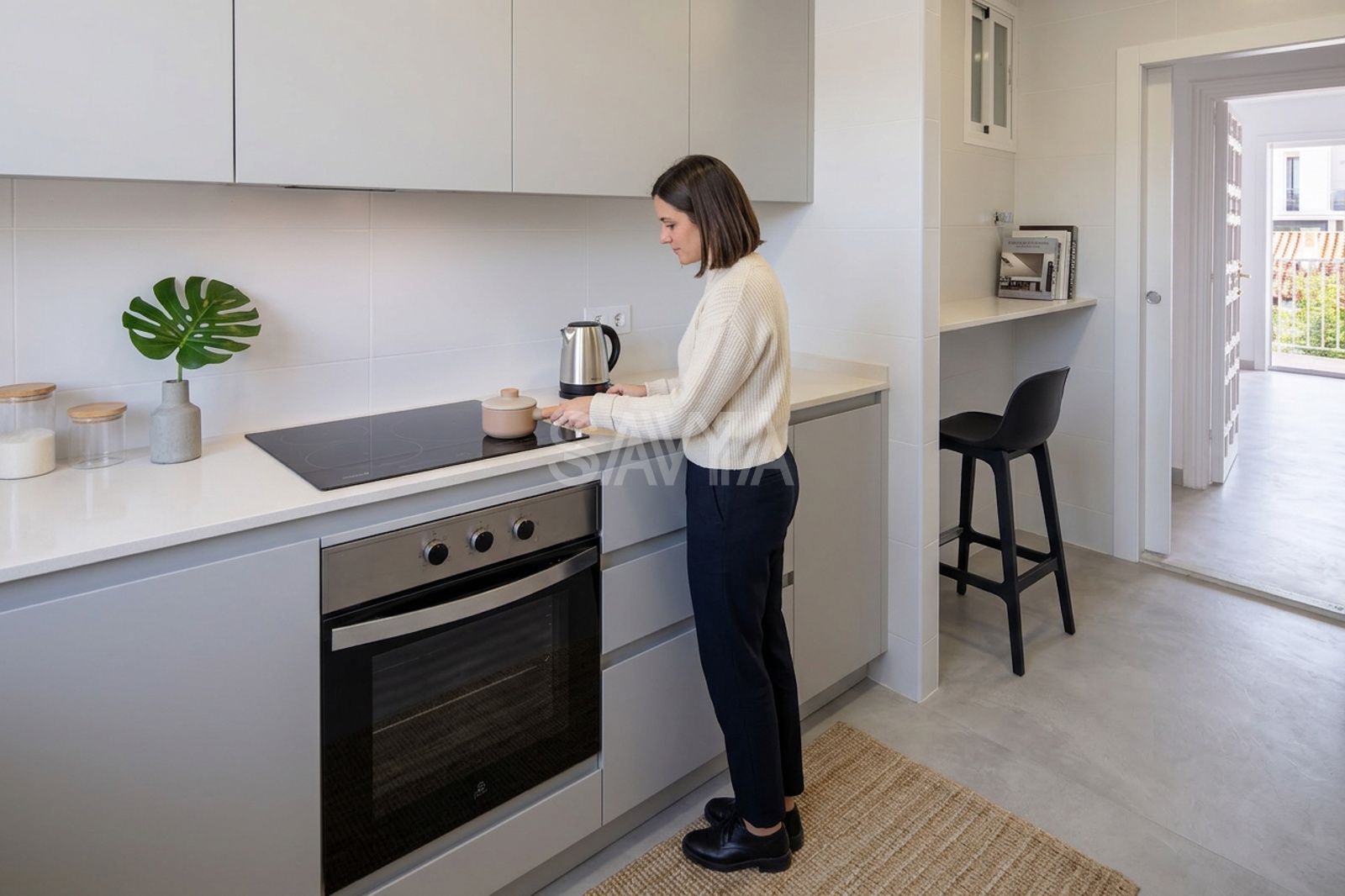 Este ático amueblado en venta, situado en Sitges, en una calle muy cercana al centro pero residencial y muy cerca de la playa, ofrece una distribución funcional y espacios amplios que maximizan la luz natural. El recibidor da paso a la cocina y al pasillo principal, definiendo una circulación clara hacia la zona de día y la zona de noche. El salón comedor se presenta como el corazón de la vivienda, con salida directa a una terraza que amplía el ambiente y permite disfrutar del exterior desde la propia estancia. La cocina, en tono blanco, se acompasa con un encimado de madera y una barra para desayunos, pensada para uso diario y para simplificar la vida en casa.