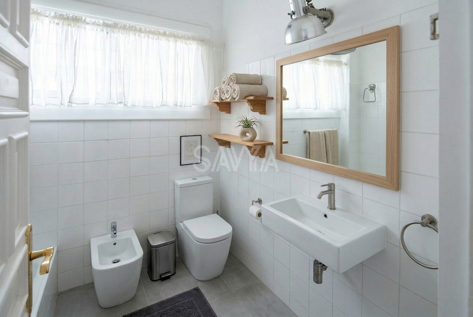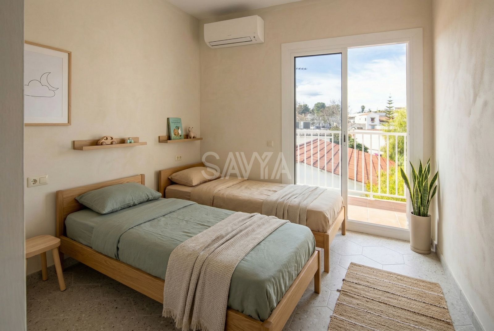 La zona de noche alberga tres dormitorios y tres baños (dos de ellos en suite con baño completo), optimizados para comodidad y privacidad. El dormitorio principal, en suite, ofrece un baño completo y un acceso directo a la terraza, mientras que uno de los dormitorios adicionales, también en suite, cuenta con acceso a la terraza y el tercero dispone de armarios empotrados. Los baños combinan funcionalidad y ventilación natural, contribuyendo a un ambiente fresco y práctico durante todo el año. El inmueble incluye calefacción por radiadores, aire acondicionado, y armarios empotrados, elementos que elevan el confort sin perder eficiencia.