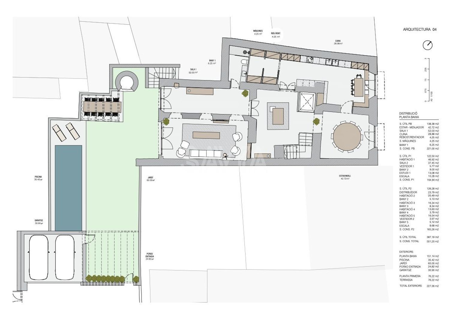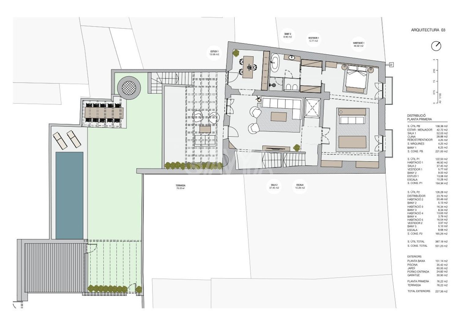 El proyecto inicial distribuye la casa en: planta baja: salón-comedor, cocina-office, distribuidor-escalera y porche; planta primera: salón de invierno, despacho, suite principal con vestidor y baño; planta segunda: 4 suites family room/despacho. El proyecto contempla ascensor interior que conecta todas las plantas, comedor de verano en el jardín (pérgola-barbacoa), aparcamiento cubierto para 2/3 coches y piscina privada.